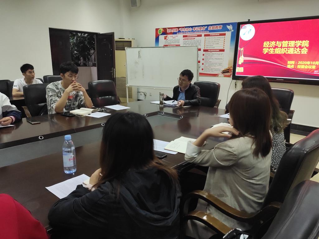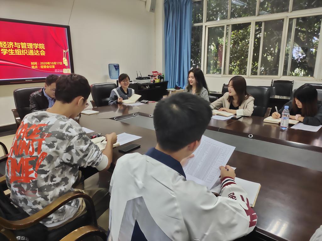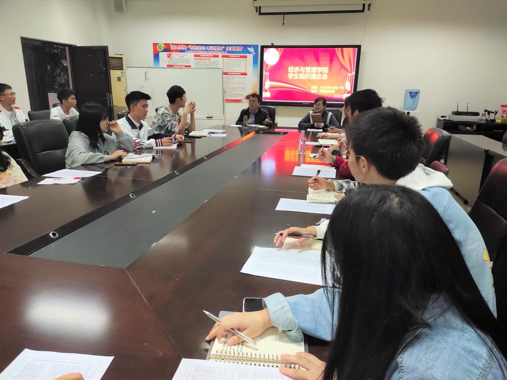 10月17日下午,经管学院于明德楼二楼经管会议室召开学生组织通达会。我院学生科老师胡遵程,分团委老师唐彩虹,学生会主席团成员,党支部、艺术团、球队联盟、青志协及各社团代表参与本次会议。